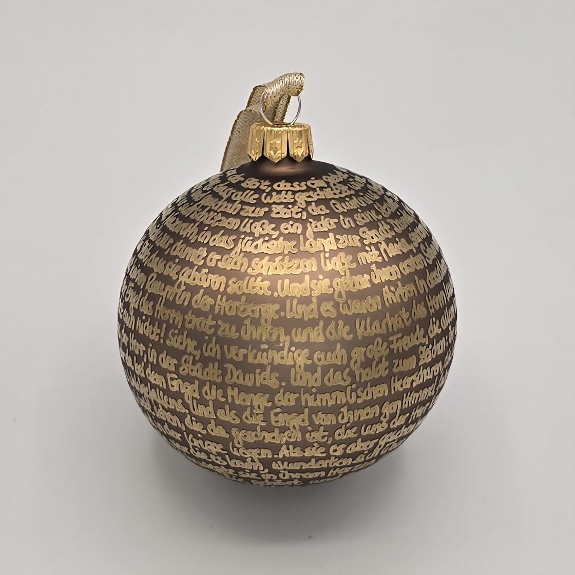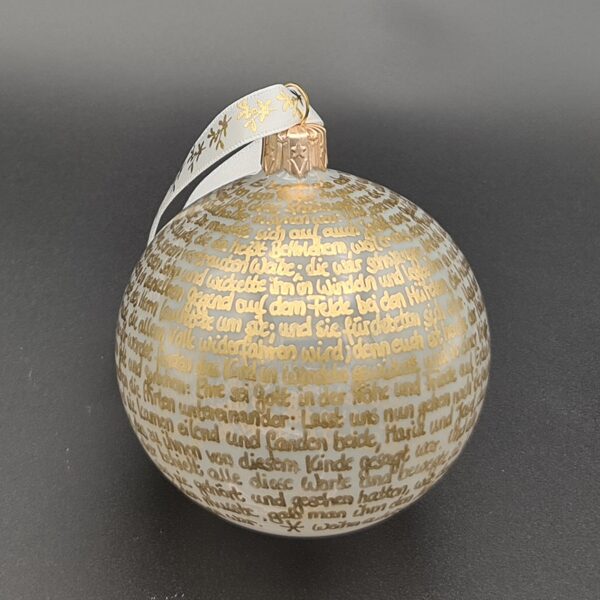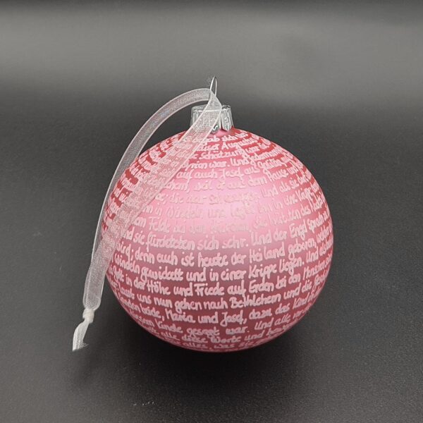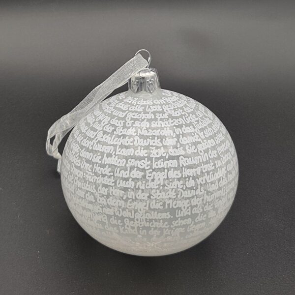 Hier findet ihr eine kleine Auswahl in verschiedenen Farbkombinationen der 8-cm-Christbaumkugeln mit der Weihnachtsgeschichte aus Lukas 2. Es handelt sich aufgrund der reinen Handarbeit beim Beschriften ausschließlich um Unikate, die Fotos sind Beispiele fertiggestellter Exemplare, die zum Teil bereits ein neues Zuhause gefunden haben. Sie zeigen die verschiedenen Möglichkeiten, Farben, Oberflächen und Schriften zu kombinieren. Nicht alle Kugelvarianten sind noch verfügbar, aber ich bin ständig auf der Suche nach neuen und interessanten Grundfarben und teste, welche Schriftfarbe mit den verschiedenen Oberflächen harmonieren könnte. Für Anfragen und Wünsche bin ich natürlich offen und berate gern dahingehend, was passt und was erfahrungsgemäß "nicht geht".