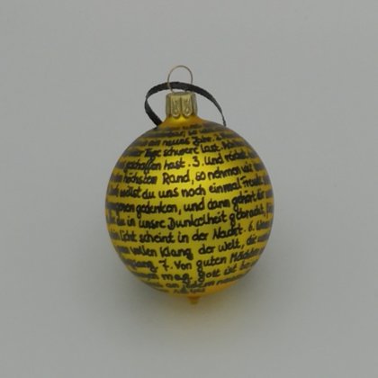 Dies sind Beispiele der kleineren mundgeblasenen 6-cm-Christbaumkugeln mit dem kompletten Gedicht von Dietrich Bonhoeffer, welches er im Dezember 1944 in Gestapohaft verfasste. Ich staune über seine Zuversicht und seinen festen Glauben angesichts der Lage, in der er sich befand, und aus der er, wie wir wissen, nicht mehr lebend nach Hause kam. Auch diese kleineren Kugeln sind Unikate, jede ist ein bisschen anders und wird ebenso handbeschrieben wie die größeren Verwandten mit 8 cm Durchmesser.